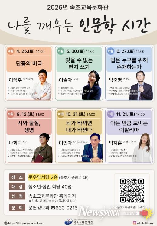 이윤전 속초교육문화관장은 “지난해 하반기 지역서점에서 운영한 인문학 시간에 보내주신 지역 주민의 관심과 호응에 힘입어 올해는 강연 횟수를 확대했다”라며 “이번 강연을 통해 청소년과 지역 주민이 다양한 분야의 인문학을 가까이에서 접하고, 각기 다른 관점과 해석을 만날 수 있기를 바란다”라고 전했다.