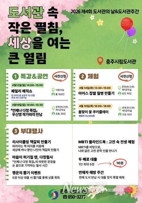 뉴스펀치 이현승 기자 | 충주시립도서관은 제4회 도서관의 날과 제62회 도서관주간을 맞아 ‘도서관 속 작은 펼침, 세상을 여는 큰 열림’을 주제로 다양한 독서문화행사를 운영한다고 3일 밝혔다.