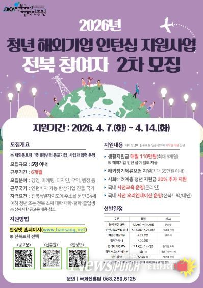 뉴스펀치 정홍균 기자 | (재)전북국제협력진흥원은 도내 청년의 해외 진출과 글로벌 역량 강화를 위해 '청년 해외기업 인턴십 지원사업' 참여자를 오는 4월 7일부터 4월 14일까지 모집한다고 밝혔다.