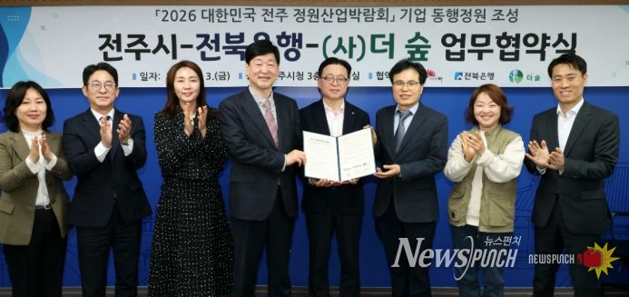 전주시와 ㈜전북은행, (사)더숲(대표 정명운)은 3일 시청 3층 소회의실에서 윤동욱 전주시장 권한대행 부시장과 김은호 전북은행 부행장, 정명운 (사)더숲 대표 등이 참석한 가운데 ‘2026 대한민국 전주정원산업박람회’ 기업동행정원 조성을 위한 업무협약을 체결했다.