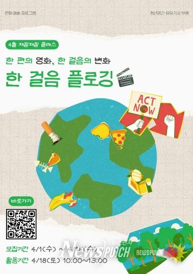 이번 4월 프로그램 ‘한 걸음 플로깅’은 오는 18일 오전 10시부터 3시간 동안 진행된다. 1부에서는 다큐멘터리 영화 ‘문명의 끝에서’(서울국제환경영화제 대상 수상작) 상영 후 임기웅 감독과 대화의 시간이, 2부에서는 갈산천, 굴포천, 청리단길 일대에서 플로깅 활동을 펼칠 예정이다.