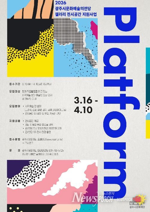 뉴스펀치 박상훈 기자 | (재)광주시문화재단은 ‘2026 광주시문화예술의전당 갤러리 전시공간지원사업 'Platform'’ 참여 작가를 4월 10일까지 공모한다.