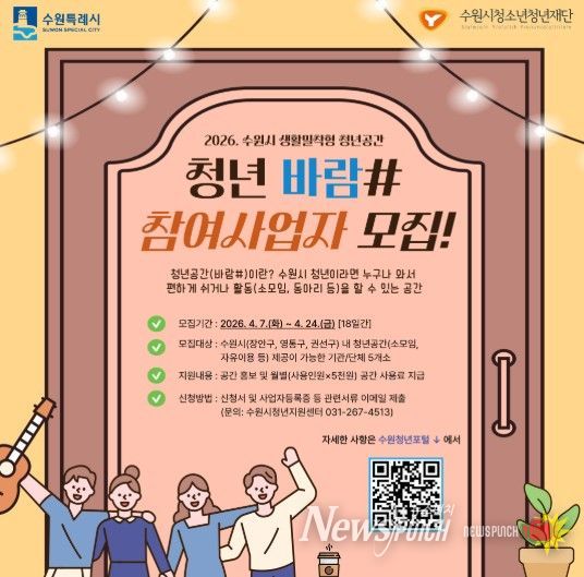 뉴스펀치 박상훈 기자 | 수원시청소년청년재단 수원시청년지원센터는 청년들의 일상 속 이용 편의성을 높이고 지역 기반 청년공간 활성화를 위해 “경기청년공간 생활밀착형 공모사업” 참여 기관‧단체를 모집한다고 밝혔다.