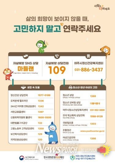 한편, 여주시민은 우울이나 불안 등으로 전문가의 도움이 필요한 경우 자살예방상담전화(109), 정신건강상담전화, 자살예방SNS상담 ‘마들랜’, 여주시정신건강복지센터(부설)자살예방센터를 통해 상담을 받을 수 있다.
