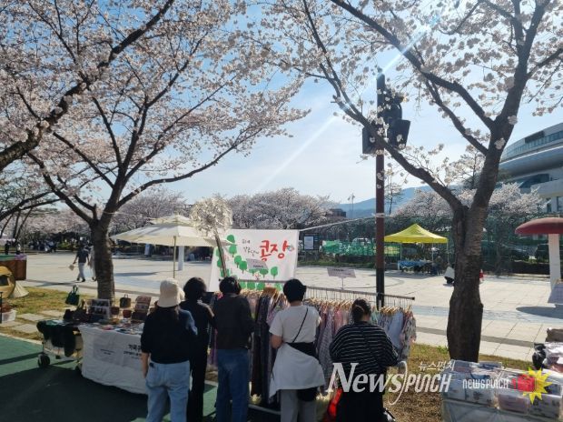 서시천체육공원 잔디광장에는 간이 텐트와 돗자리, 양산 등을 갖춘 휴식 공간이 마련됐고, 방문객들은 봄날 야외 나들이를 즐기듯 장터를 둘러봤다.
