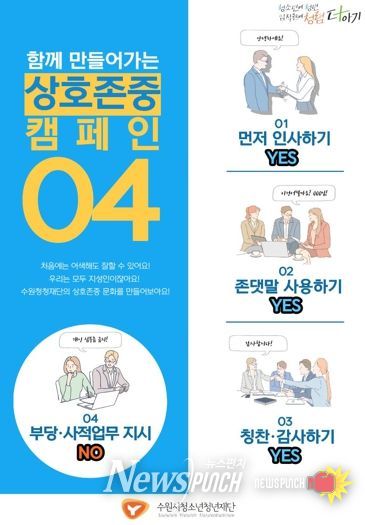 뉴스펀치 박상훈 기자 | 수원시청소년청년재단은 조직 내 상호존중 문화 확산과 인권경영 및 청렴 실천 강화를 위해 ‘상호존중의 날’ 캠페인을 운영한다고 밝혔다.