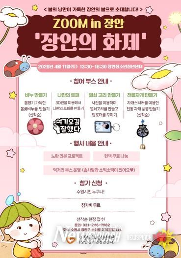 뉴스펀치 박상훈 기자 | 수원시청소년청년재단 장안청소년청년센터는 오는 4월 11일, 봄의 낭만을 가득 담은 프로그램 ZOOM IN 장안 ‘장안의 화제’를 개최한다고 밝혔다.