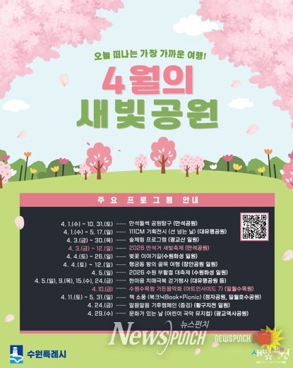 뉴스펀치 박상훈 기자 | 수원특례시는 4월 한 달간 도시공원과 수목원, 도심 주요 공간에서 시민이 참여할 수 있는 다양한 봄 프로그램을 운영한다. 체험·문화·생태·체육 활동을 확대해 공원을 일상 속 여가와 배움의 공간으로 활용할 계획이다.