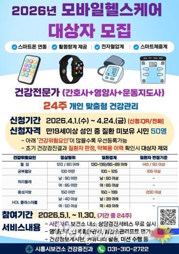 뉴스펀치 박상훈 기자 | 시흥시보건소 건강증진과는 시민 건강 증진과 만성질환 예방을 위해 ‘2026년 모바일 헬스케어 사업’을 오는 5월부터 11월까지 운영하고, 참여자 50여 명을 4월 24일까지 모집한다고 밝혔다.