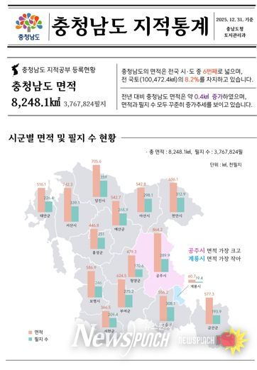 뉴스펀치 이현승 기자 | 충남도는 ‘2026년 지적통계*’ 분석 결과, 도의 전체 토지 면적이 전년 대비 0.4㎢가량 늘어난 8248.1㎢(376만 7824필지)로 집계됐고 도내 생활·교통·산업 기반 시설 면적이 증가했다고 5일 밝혔다.