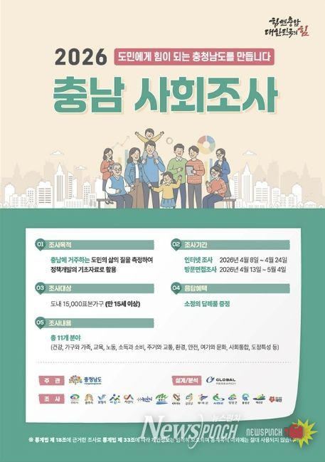 뉴스펀치 이현승 기자 | 충남 서산시는 4월 8일부터 5월 4일까지 ‘2026년 충남 사회조사’를 진행한다고 밝혔다.