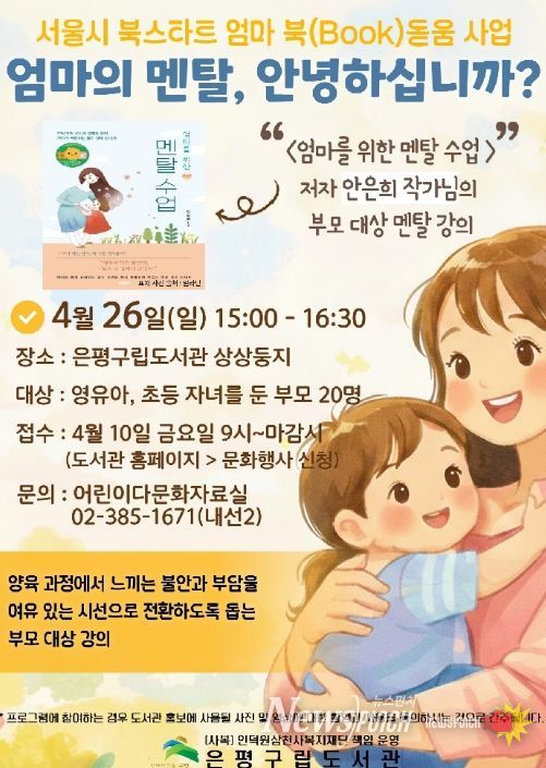 신청 대상은 영유아 및 초등 자녀를 둔 부모 20명이며, 4월 26일 은평구립도서관에서 약 90분간 진행된다. 접수는 4월 10일부터 은평구립도서관 누리집 ‘문화행사 신청’에서 가능하다.