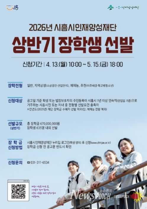 뉴스펀치 박상훈 기자 | (재)시흥시인재양성재단은 지역 인재 양성과 교육 기회 확대를 위해 ‘2026년 상반기 장학생’을 635명 내외로 선발한다. 장학금 규모는 총 6억 7천만 원이다.