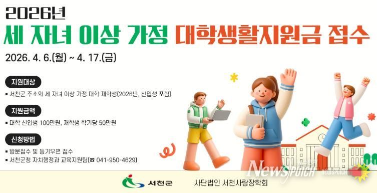 (사)서천사랑장학회는 ‘2026년도 상반기 세 자녀 이상 가정 대학생활지원금 지원계획’을 공고하고, 오는 4월 6일부터 17일까지 2주간 지원 신청을 받는다.
