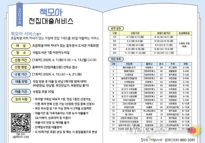 뉴스펀치 박상훈 기자 | 동두천시 시립도서관은 2026년 4월부터 12월까지 ‘책모아’ 전집 대출 서비스를 총 5회에 걸쳐 운영한다고 밝혔다.