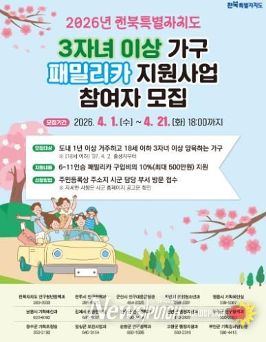 뉴스펀치 정홍균 기자 | 임실군은 3자녀 이상 다자녀 가구의 가족 동반 이동 여건 개선 및 안정적인 양육 환경을 조성하기 위해 ‘3자녀 이상 가구 패밀리카 지원사업’신청을 접수한다고 1일 밝혔다.