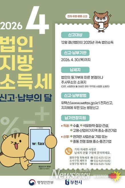 뉴스펀치 박상훈 기자 | 부천시는 법인지방소득세 신고가 집중되는 4월을 맞아 이달 30일까지 ‘법인지방소득세 집중 신고기간’을 운영한다. 이에 따라 시는 신고 기간에 구청 세무부서에 전용 상담창구를 설치해 신고 편의를 지원할 예정이다.