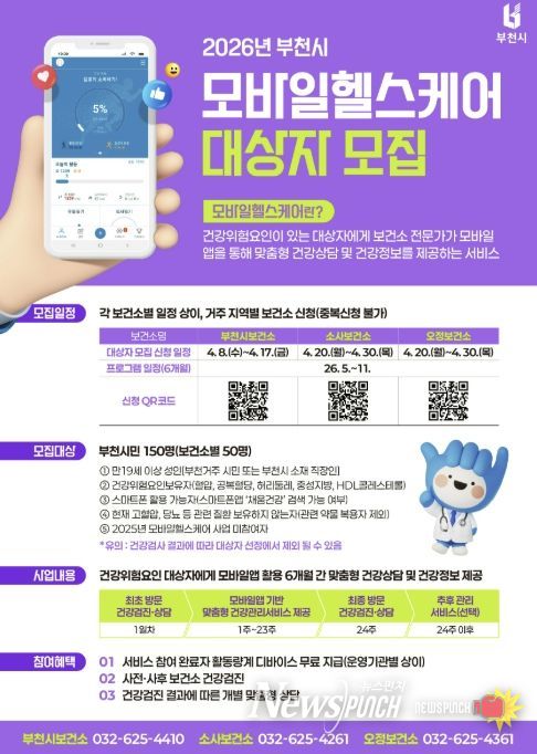참여 신청은 홍보 포스터 내 QR코드를 통해 가능하며, 신청 일정은 부천시보건소는 4월 8일부터 4월 17일까지, 소사보건소와 오정보건소는 4월 20일부터 4월 30일까지 진행된다.