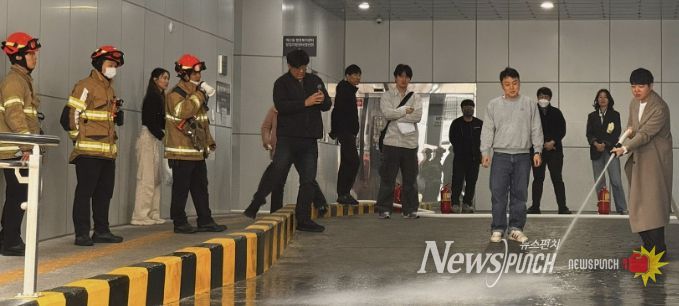 훈련은 화재 발생 시 행동 요령 교육을 시작으로 ▲연기 발생 상황을 가정한 대피 훈련 ▲교육용 소화기 사용 실습 ▲옥내 소화전 살수 실습 순으로 진행됐으며, 참가자들은 실제 화재 상황에 대비한 대응 능력을 체득했다.