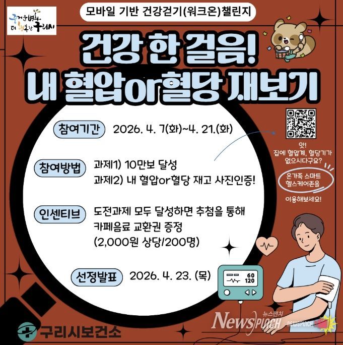 뉴스펀치 박상훈 기자 | 구리시는 시민들의 건강생활 실천을 유도하고 만성질환 예방 관리를 강화하기 위해 ‘건강 한 걸음! 내 혈압·혈당 재보기’ 도전 잇기를 오는 4월 7일부터 21일까지 15일간 운영한다고 밝혔다.