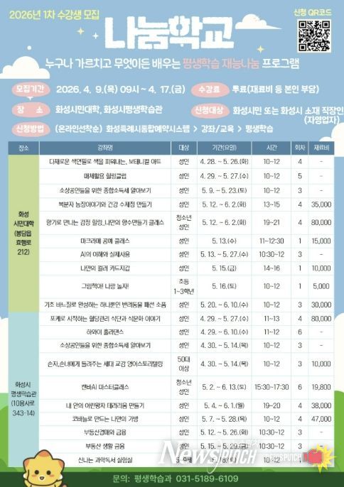 뉴스펀치 박상훈 기자 | 화성특례시는 시민 간 지식과 재능을 나누는 평생학습 프로그램 ‘나눔학교’의 2026년 1차 수강생을 오는 4월 9일부터 4월 17일까지 선착순으로 모집한다.