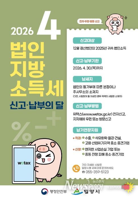 뉴스펀치 박세훈 기자 | 경남 밀양시는 관내 사업장을 둔 2025년 12월 결산법인을 대상으로 오는 4월 30일까지 법인지방소득세를 신고·납부해야 한다고 밝혔다.