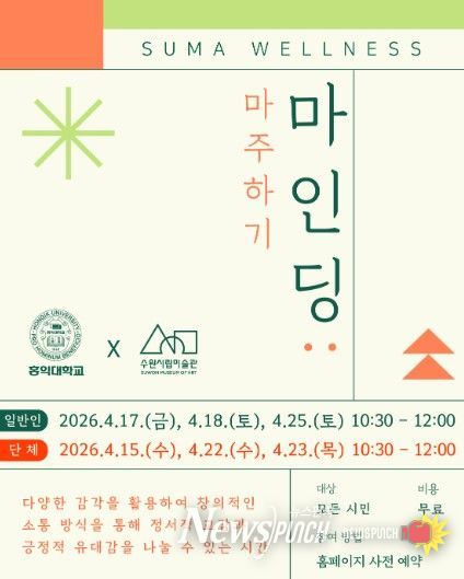 뉴스펀치 박상훈 기자 | 경기도 수원시립미술관은 고령화, 우울, 사회적 단절 등의 문제를 예술로 접근하고, 치유하는 사회적 처방 프로그램 2026 'SUMA 웰니스(Wellness) 마인딩: 마주하기'를 4월 15일부터 운영한다.