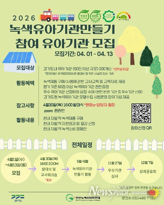 뉴스펀치 박상훈 기자 | 경기도가 아이들이 생활 속에서 올바른 녹색 소비 습관을 가질 수 있도록 돕는 ‘2026년 녹색유아기관만들기’ 참여 기관 200곳을 4월 13일까지 모집한다.