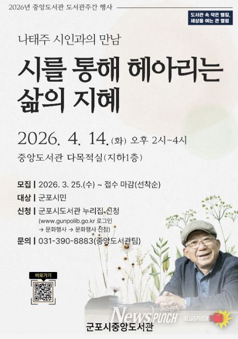 뉴스펀치 박상훈 기자 | 군포시중앙도서관은 제62회 도서관주간을 맞아 시민들이 시를 통해 삶의 여유와 위로를 느낄 수 있도록 나태주 시인과 함께하는 특별 프로그램을 운영한다.