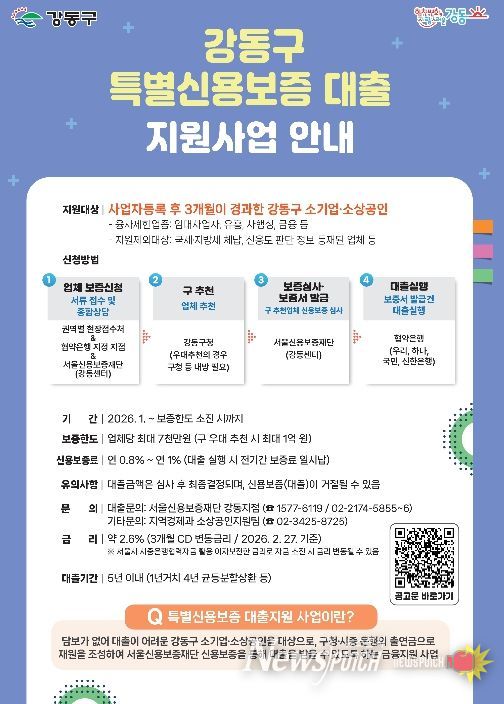 현재 현장 접수처 운영은 종료됐지만, 강동구 소상공인은 서울신용보증재단 강동종합지원센터 또는 4개 협력 은행(국민·신한·우리·하나) 관내 영업점을 통해 보증 한도 소진 시까지 특별신용보증 대출을 신청할 수 있다.