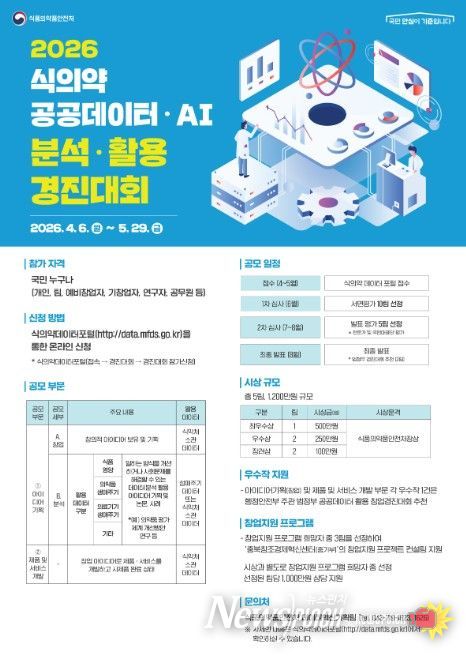 뉴스펀치 정홍균 기자 | 식품의약품안전처는 국민의 건강과 안전을 지키고 식의약 데이터를 활용한 창업 촉진 및 창의적 비즈니스 모델 발굴에 도움을 주고자 ‘2026년 식의약 공공데이터·AI 분석·활용 경진대회’를 개최한다고 밝혔다.