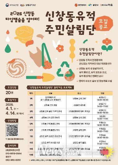 광산구는 ‘신창동 유적 주민살림단’ 클린가든 프로젝트에 참여할 주민 20명을 선착순 모집한다.