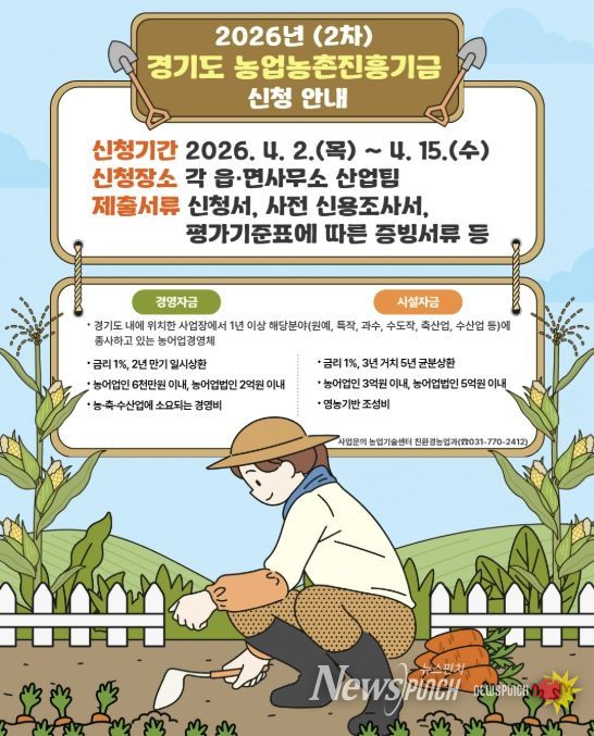 뉴스펀치 박상훈 기자 | 양평군은 농어업인의 소득 향상과 삶의 질 개선, 경영 안정을 도모하고 농업 경쟁력 강화를 위해 ‘2026년 경기도 농업농촌진흥기금 경영 및 시설자금 지원’ 2차 대상자를 모집한다고 밝혔다.
