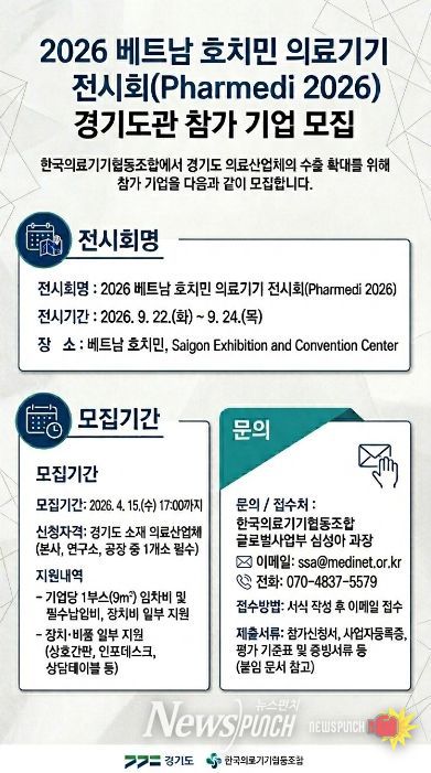 뉴스펀치 박상훈 기자 | 경기도가 도내 의료산업체 해외 진출 지원을 위해 ‘2026년 베트남 호치민 의료기기 전시회(Pharmedi 2026)’에 참여할 기업을 오는 15일까지 모집한다.