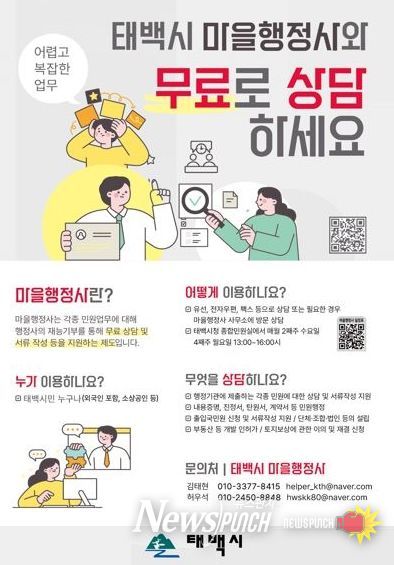 태백시 관계자는 “마을행정사 운영으로 시민들 누구나 손쉽게 행정 업무를 볼 수 있게 되길 기대하며, 취약계층 지원을 통해 민원 사각지대를 해소해 나가고자 한다”라며 “앞으로도 주민 편의를 위한 제도들을 지속적으로 마련해 나가고 지원을 아끼지 않겠다”라고 말했다