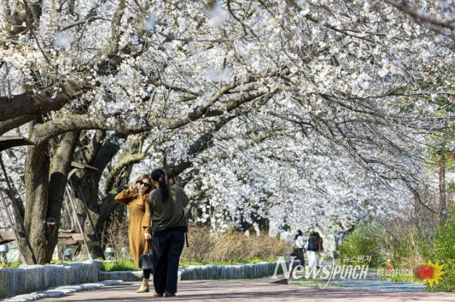 뉴스펀치 이현승 기자 | 충북 괴산군 괴강과 청안면 일대에 벚꽃이 만개하며 봄 정취를 즐기려는 나들이객들의 발길이 이어지고 있다.