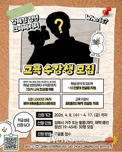 뉴스펀치 박세훈 기자 | 김해시는 1인 미디어 크리에이터를 새로운 직업군으로 육성하고 지역 청년들의 취·창업 역량을 강화하기 위해 ‘2026년 김해형 청년 1인 크리에이터 육성사업’ 교육생을 모집한다고 8일 밝혔다.