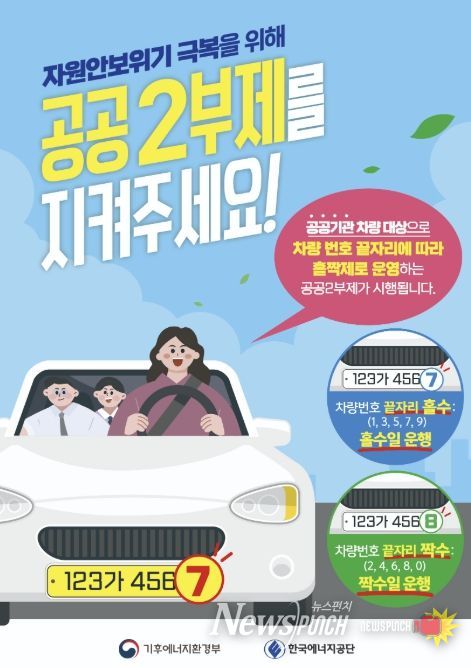 정부는 4월 8일부터 공공기관 승용차 5부제를 2부제(홀짝제)로 강화해 시행하고 있다. 차량 번호판 끝자리가 홀수이면 홀수일, 짝수이면 짝수일에만 운행할 수 있으며, 토요일·일요일과 공휴일은 제외된다. 또한 공공기관이 운영하는 공영주차장에는 승용차 5부제가 별도로 적용된다.