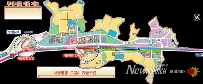 또 앞서 발표된 부산방향 진출입 노선 및 사송지구와의 연계성, 하이패스 IC 설치 기준(고속도로 분기점과 1㎞, IC ․ 휴게소와 2㎞ 이상) 등을 종합적으로 검토한 결과, 서울방향 진입 노선(안)은 양산휴게소를 활용하는 방안이 사실상 유일한 것으로 분석됐다.