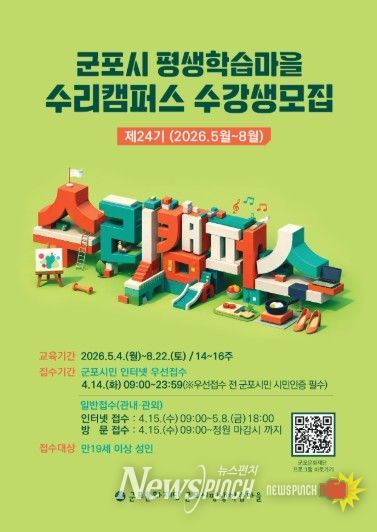 뉴스펀치 박상훈 기자 | 군포문화재단은 오는 4월 14일부터 군포시평생학습마을 제24기(2026년 5월~8월) 수리캠퍼스 수강생을 모집한다고 밝혔다.