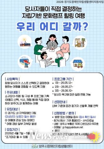 뉴스펀치 박상훈 기자 | 양주시장애인자립생활센터에서는 장애인 당사자가 직접 선택하고 결정하는 자립 기반 힐링 여행을 목적으로 하는 지역 장애인 문화캠프 [우리 어디 갈까?] 참가자를 모집한다.