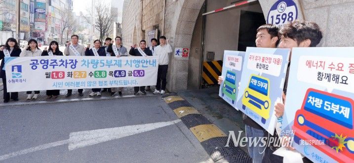 수원시는 8일 수원시청 본관 주차장, 수원시의회 지상 주차장, 수원시청 별관주차장에서 공공기관 2부제·공영주차장 5부제 알리는 캠페인을 펼쳤다.