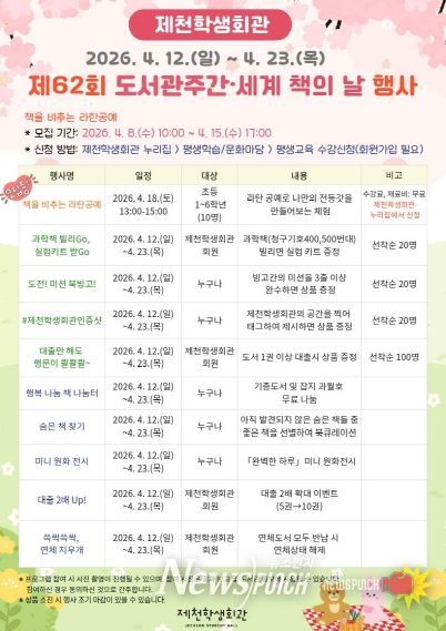 제천학생회관장은 “도서관주간을 맞아 누구나 부담 없이 도서관을 찾고, 책을 통해 새로운 즐거움과 경험을 얻는 시간이 되길 기대한다”며 “앞으로도 지역과 함께하는 열린 문화공간으로서 역할을 이어가겠다”고 밝혔다.