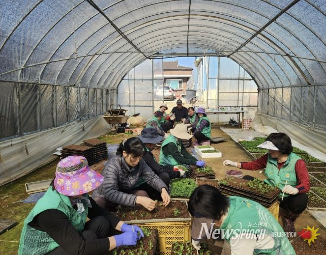 이번 작업에는 신평면 새마을지도자와 각 마을 부녀회장 등 총 42명이 참여해, 그동안 노지에 파종해 정성껏 길러온 꽃씨를 모종 포트로 옮겨 심는 작업을 함께 진행했다.