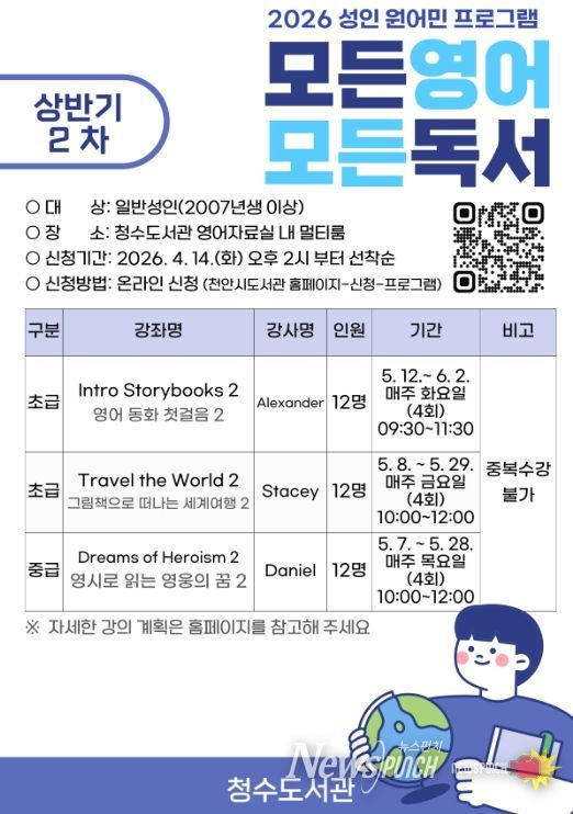 뉴스펀치 이현승 기자 | 천안시 청수도서관은 내달부터 원어민 영어 독서프로그램 ‘모든 영어 모든 독서’ 수강생을 모집한다고 9일 밝혔다.