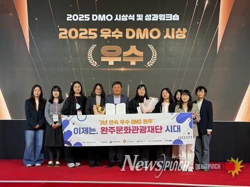 뉴스펀치 정홍균 기자 | 완주문화관광재단은 지난 8일 서울 정동 1928아트센터에서 열린 ‘2025년 우수 DMO 시상식’에서 전국 22개 지자체 중 A등급을 획득, 3년 연속 ‘우수’등급 달성과 함께 한국관광공사 사장상을 수상했다고 밝혔다.
