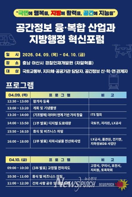 뉴스펀치 정홍균 기자 | 국토교통부 국토지리정보원은 4월 9일부터 이틀간 충남 아산에서 '공간정보 융·복합 산업과 지방행정 혁신포럼'을 개최한다.