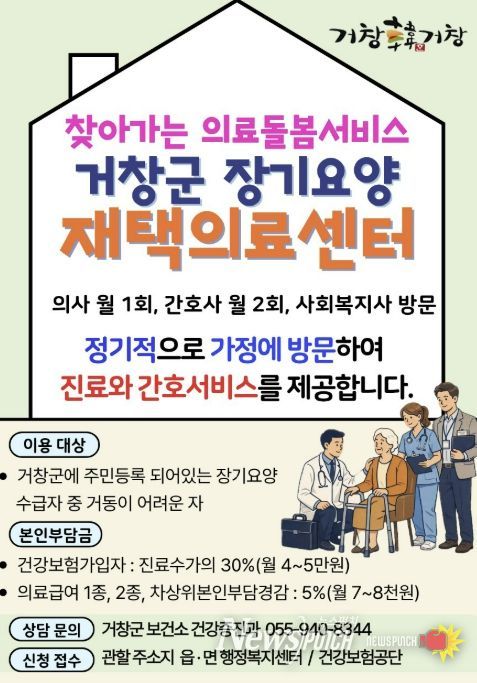 이번 사업은 장기요양등급판정자 중 거동이 불편해 평소 병원 방문이 어려운 의료취약대상자에게, 살고 있는 집에서 의료·요양·돌봄 서비스를 통합적으로 받을 수 있도록 지원하는 것이 핵심이다. 특히 거창군은 보건소가 중심이 되어 지역 의료기관과 협력하는 보건소 협업형 모델로 운영된다는 점에서 의미가 크다.