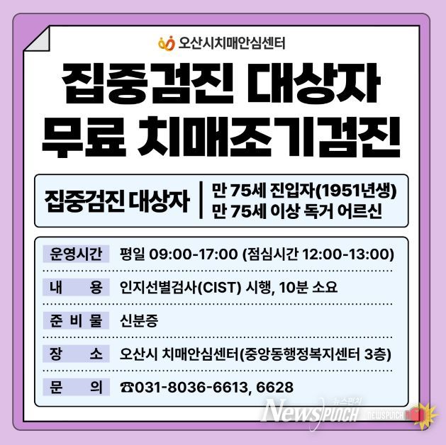 뉴스펀치 박상훈 기자 | 오산시치매안심센터는 치매의 조기 발견과 예방적 관리를 위해 관내 만 75세 진입자(1951년생) 및 만 75세 이상 독거 어르신을 대상으로 치매 집중검진을 실시한다고 밝혔다.