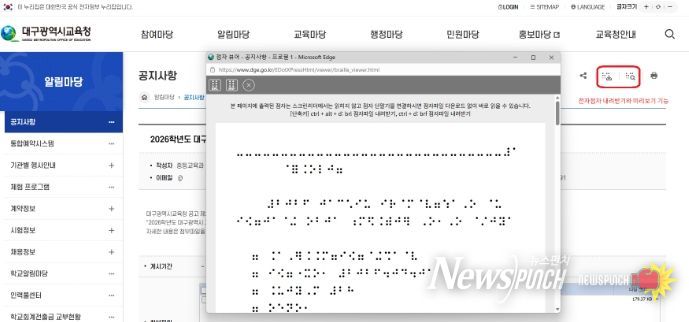 뉴스펀치 조평훈 기자 | 대구시교육청은 4월부터 시각장애인과 저시력자 등 정보 취약계층의 정보 접근성을 높이기 위해 시교육청 대표 누리집에 ‘전자 점자 서비스’를 도입해 운영한다.